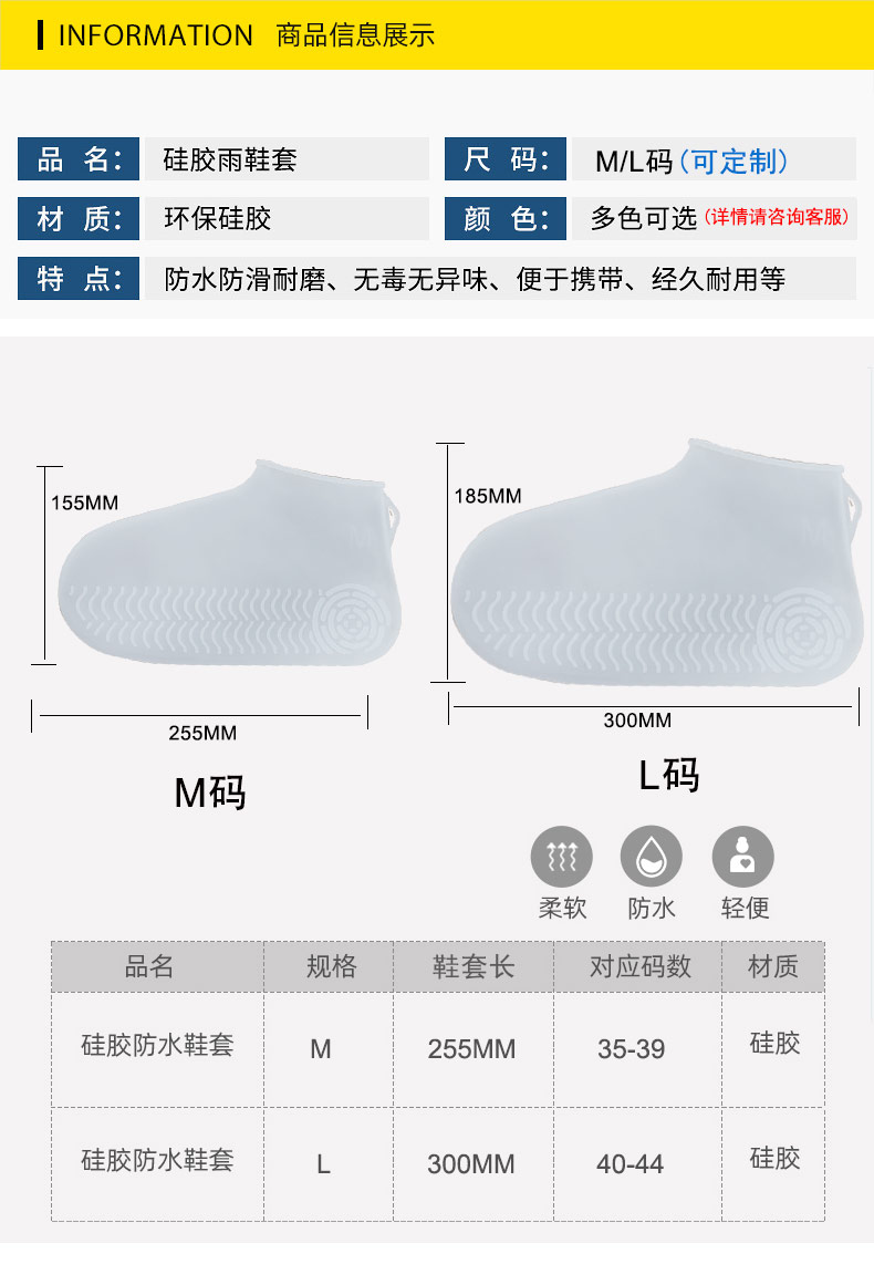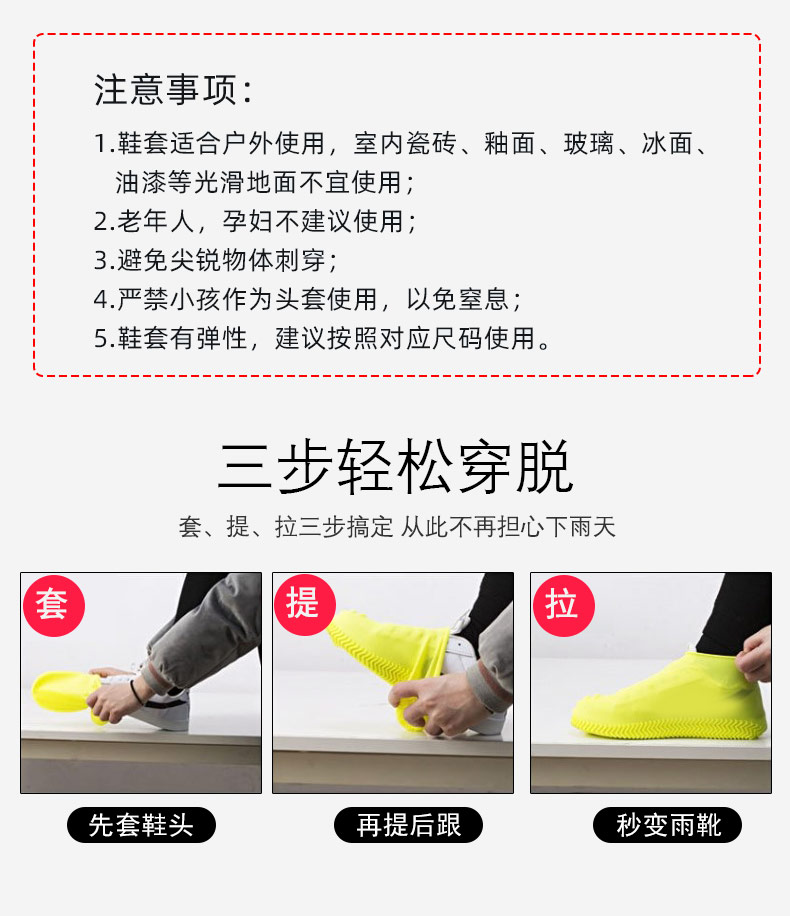 這款硅膠防水鞋套使用的時候就比較方便了,在需要使用的的時候把鞋套進(jìn)去就可以了,小巧方便,不占地方又不影響美觀,方便省時,重要的是,即使是大雨磅礴的天氣,你的鞋子依舊可以完好無損。它使用的是食品級硅膠原材料制作的,環(huán)保安全,無異味,不會讓你聞到任何廉價塑料的味道。
