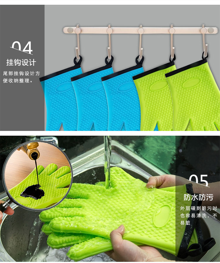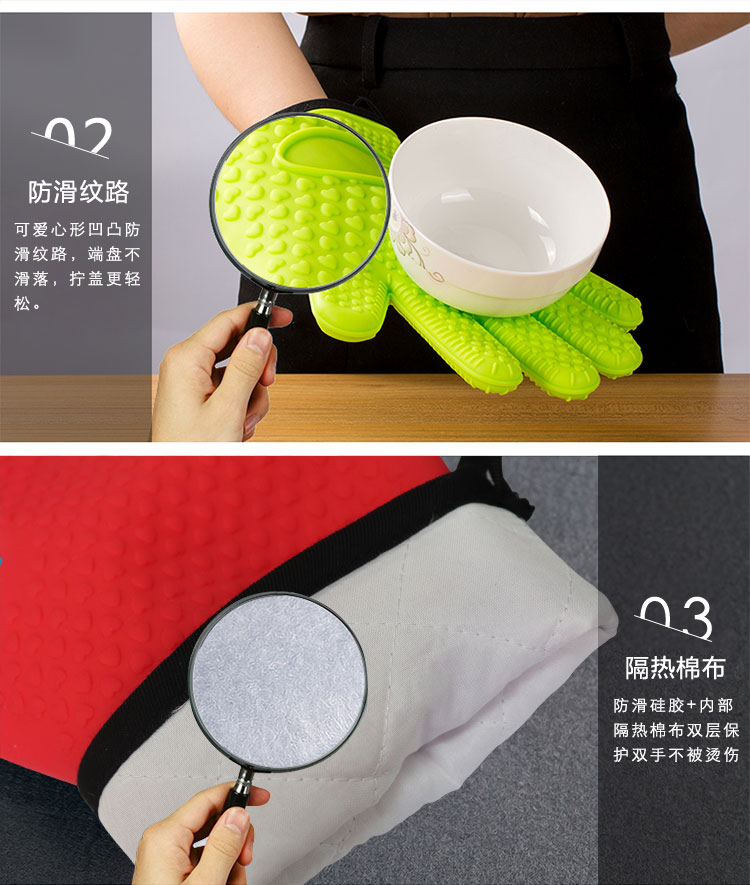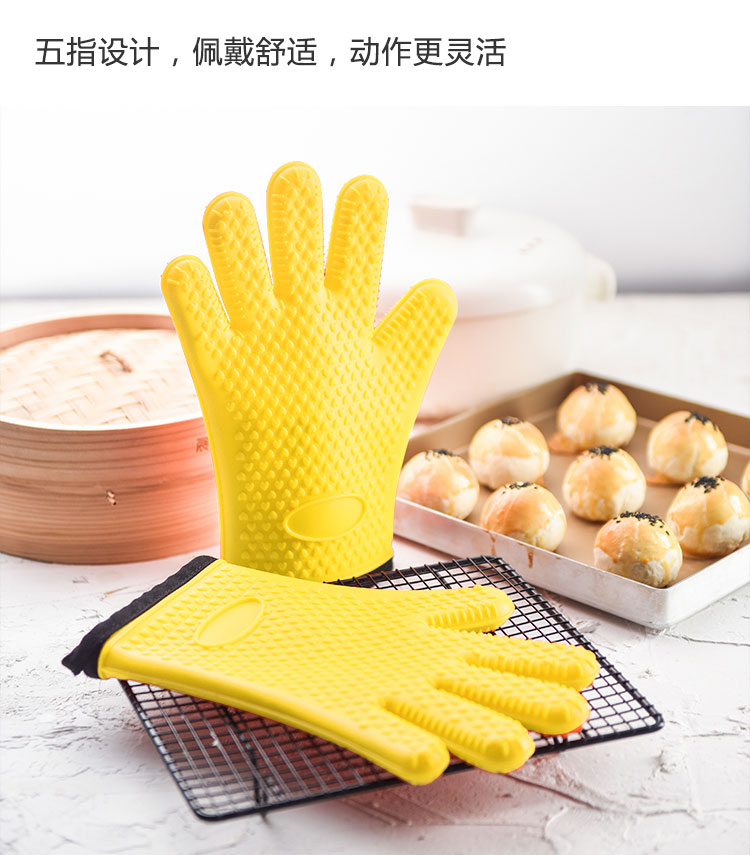 硅膠烘焙手套質(zhì)地柔軟,分指設(shè)計(jì),防滑防臟,內(nèi)置隔熱棉,有效保護(hù)雙手。